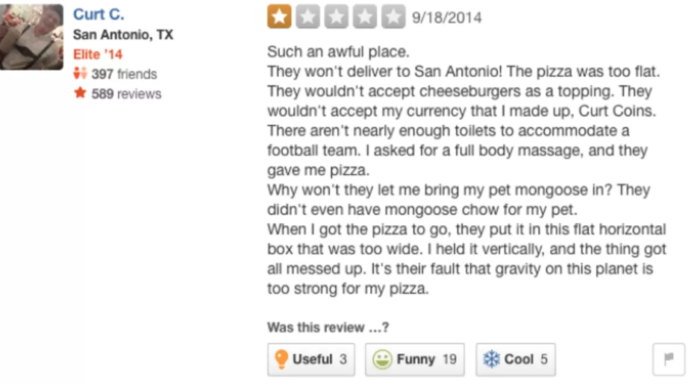 While navigating this app (sometimes just for fun), I’ve found it to be pretty entertaining. Some reviewers have had undeniable, comical eating experiences, while others have a little too much time on their hands. Nonetheless, these reviews can be funny AF.