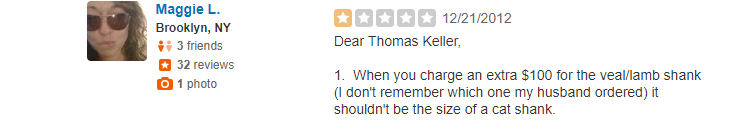 I truly appreciate the honesty about food from Yelp reviewers. The reviews about the service and hospitality are even better. I’m not a finicky person when it comes to food. I don’t hold anyone (except my mom) to super high standards. However, I can’t stand spending my hard-earned money at an establishment with appalling service or sanitation. And since I’ve sadly, and frequently, endured these unpleasant circumstances, I don’t eat anywhere without checking Yelp first.