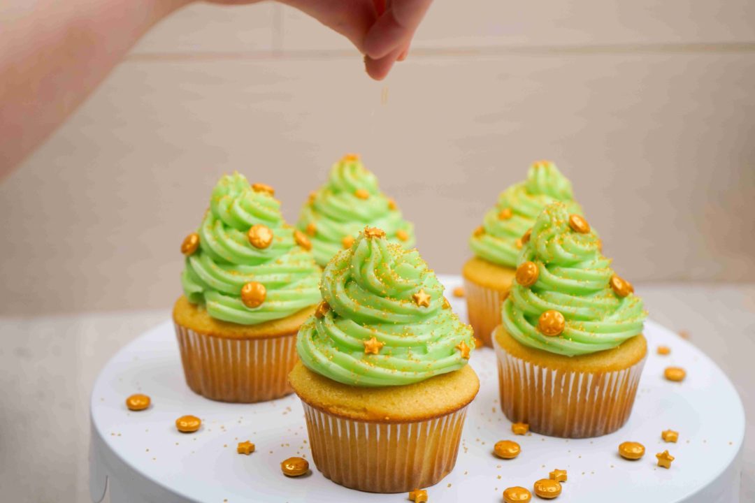 When your box cake mix cupcakes are out of the oven and cooled enough (don’t pipe frosting onto warm cupcakes unless you want a melted, gooey MESS), have fun with different piping designs. If you need a bit of a warm-up before piping on the actual cupcake, grab some parchment paper and test it out — that way you can easily scrape the frosting back into the piping bag when you’re done.