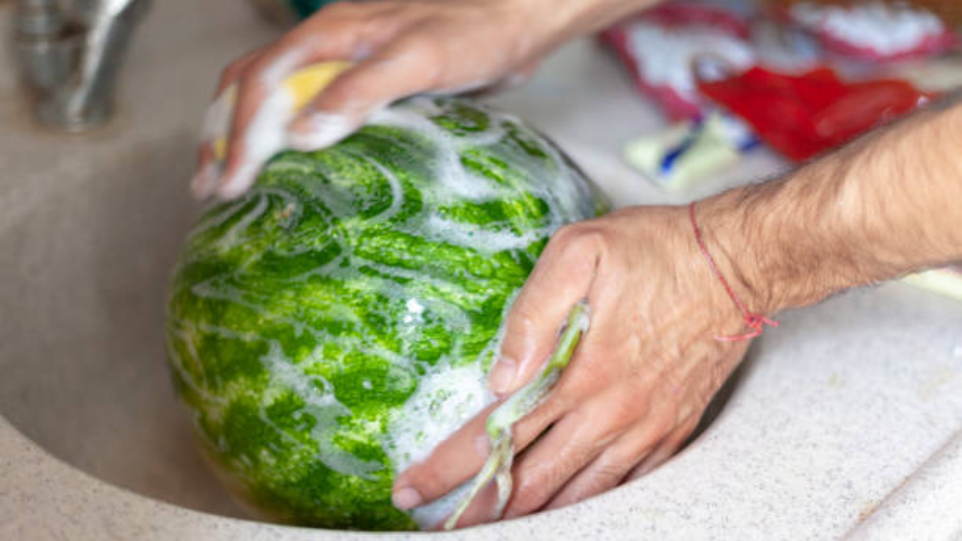 Washing a watermelon doesn’t require soap, bleach, or special sprays. Experts recommend rinsing it under cool running water, scrubbing with a clean produce brush, and drying it with a paper towel before cutting. The friction helps remove surface contaminants.