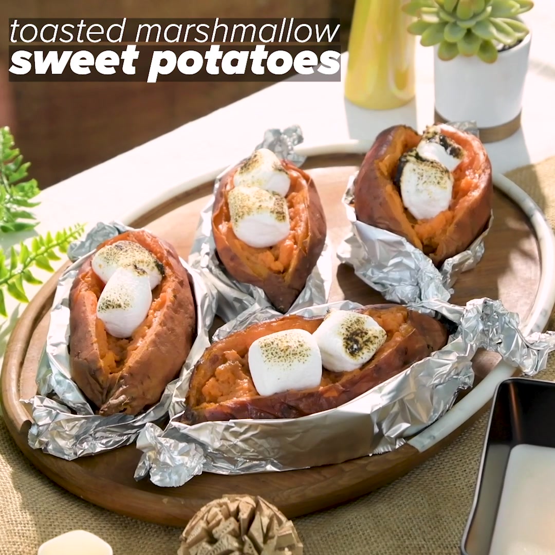 - Add two marshmallows onto a wooden skewer and pierce each foil-wrapped sweet potato with the same skewer, roasting the marshmallow on the grill until desired toasted level.