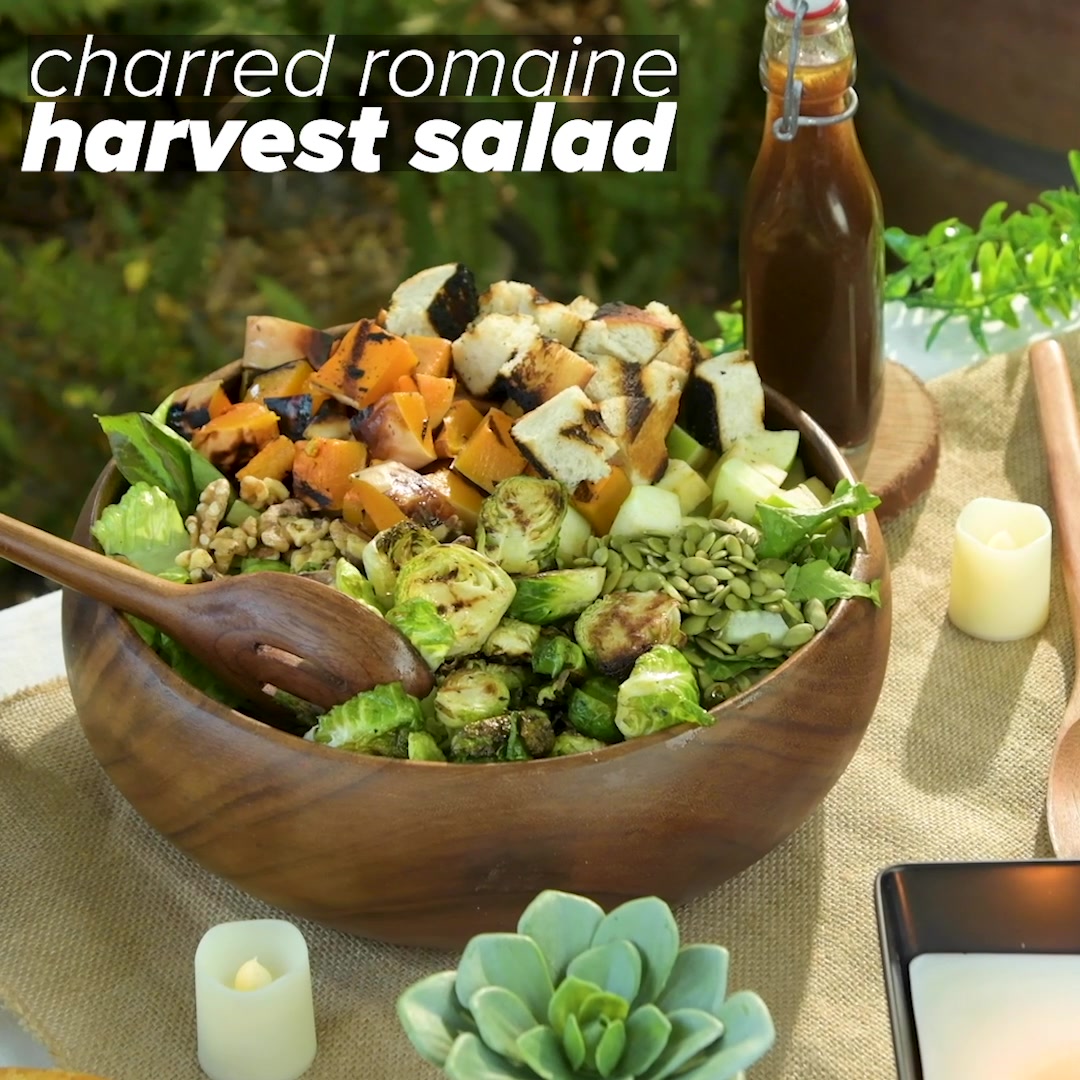 - Assemble salad by chopping grilled romaine and topping with grilled and chopped butternut squash and diced crusty bread. Add seared brussels sprouts, toasted pumpkin seeds, and finish with red wine vinaigrette.