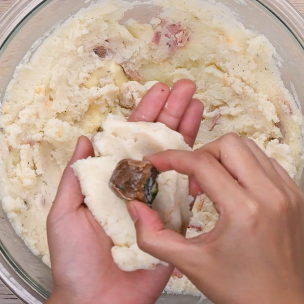 Roll and knead the mashed potatoes in your hands until the gravy cube is completely encased. They don’t have to be perfectly spherical. Repeat this step until either you run out of gravy cubes or mashed potatoes.